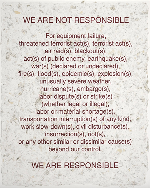 In this particular iteration of an ongoing project that incorporates an amended standard corporate disclaimer, Industry of the Ordinary have purchased second-hand bibles from which to make paper. On this idiosyncratic surface, employing wine-infused, blood-red ink, they have imposed the adapted text