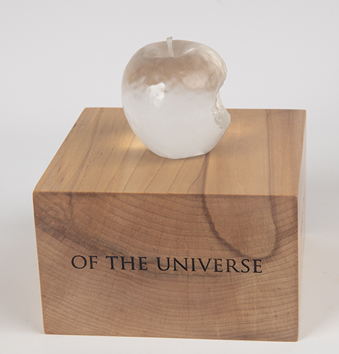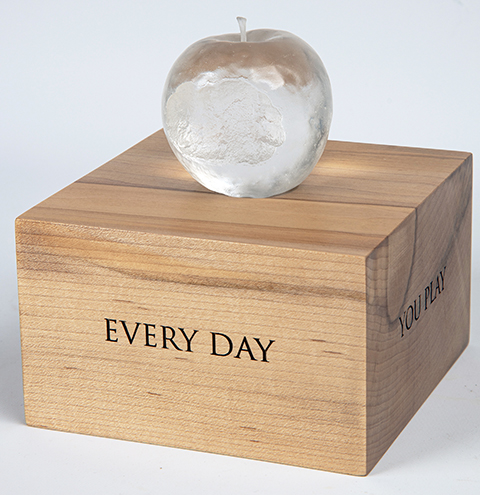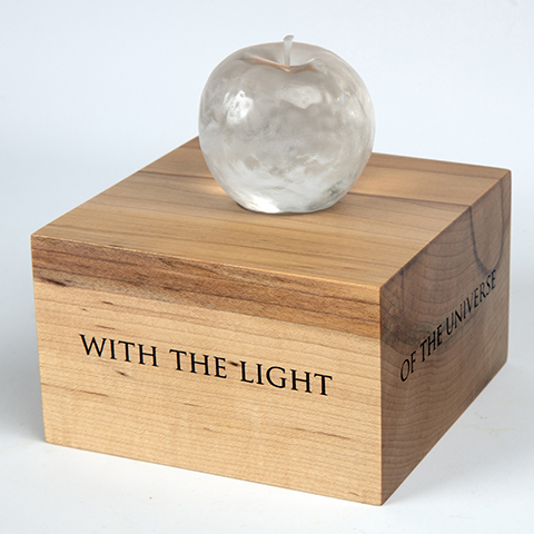 The title of the work, “Every day / you play / with the light / of the universe” is borrowed from Chilean poet, Pablo Neruda. The crystal apple plays with the light as it passes through the object. Every day, we all play with the light of the universe, and sometimes we suffer for it.