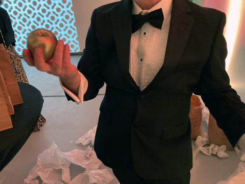 In the spirit of Discordianism, and in the belief that chaos and order are products of the imagination, Industry of the Ordinary and their surrogates present a gift of a golden apple to the Hyde Park Art Center 2022 Gala attendees, packaged in its own container.