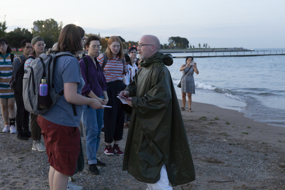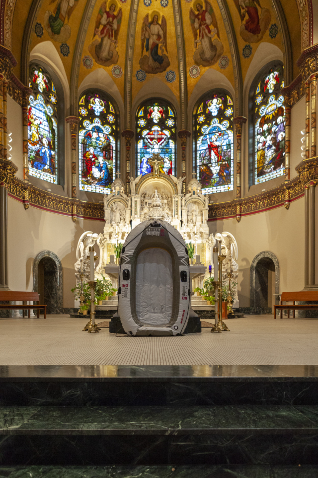 The current Pope, Francis, has divided the Catholic Church with his admonitions to treat all people with dignity and respect. On Columbus Day, which is also Indigenous People’s Day, Monday October 8th 2018, Industry of the Ordinary hold a vigil and remembrance for the many thousands of displaced people who have recently tried, and often failed, to find safe harbor. They carry a life raft through the Saint Vincent De Paul church in Chicago and thence down Fullerton Avenue to the shoreline of Lake Michigan.