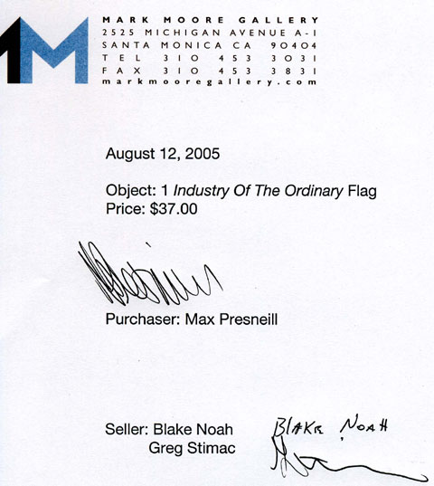 We were unable to plant the Industry of the Ordinary flag at the summit of Mt. Saint Helens, due to a rise in volcanic activity in the area. As an alternative we decided to sell the flag to a gallery in Los Angeles. On August 12th Max Presneill of the Mark Moore Gallery participated in our proxy performance by purchasing the Industry of the Ordinary flag. It was sold at the price of $37.00, the cost of a tank of gasoline.